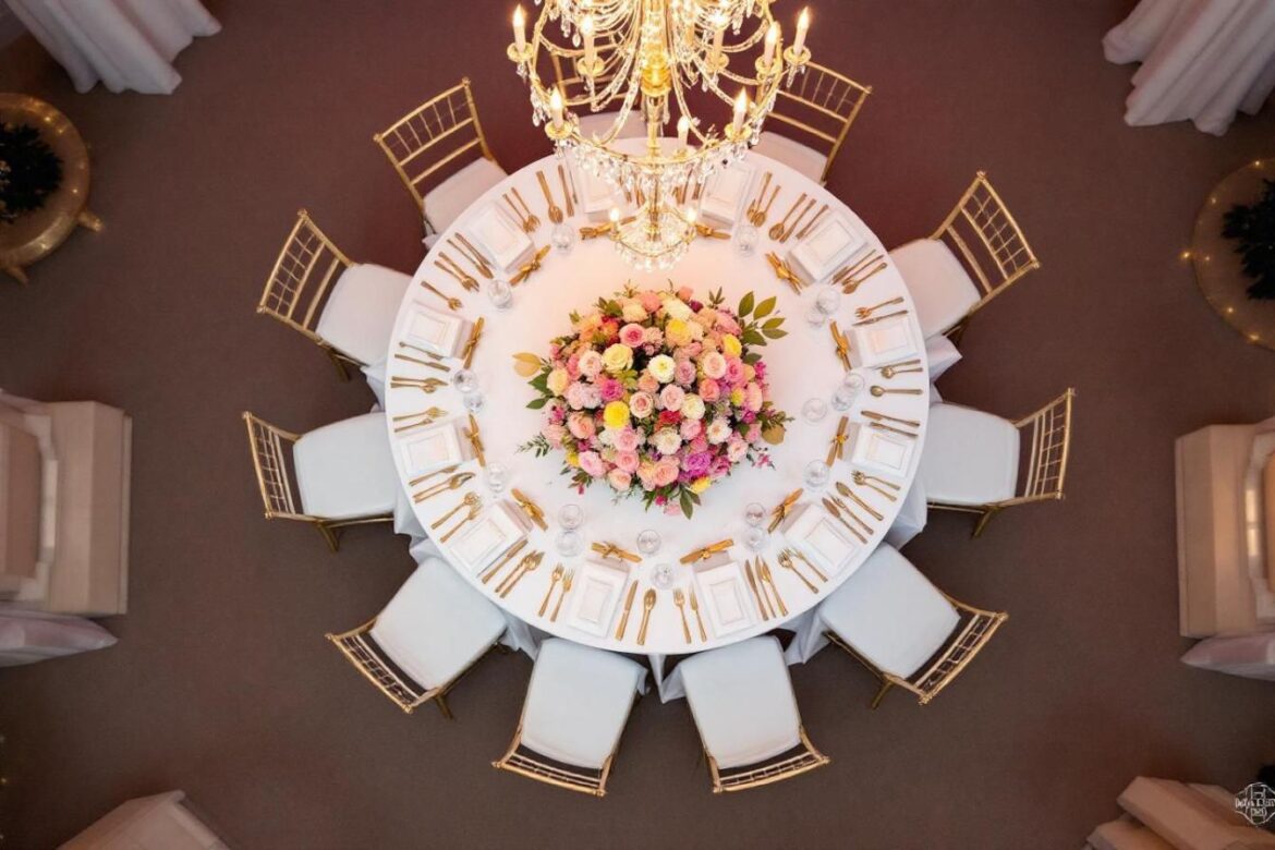 Le centre de table peut raconter votre histoire grâce à des objets symboliques. Lanterne vintage, mini cadres photos ou bouquets suspendus apportent une touche personnelle et originale. Varier les hauteurs – vases bas, chandeliers élancés – donne du rythme tout en préservant l’équilibre indispensable à une belle table ronde.